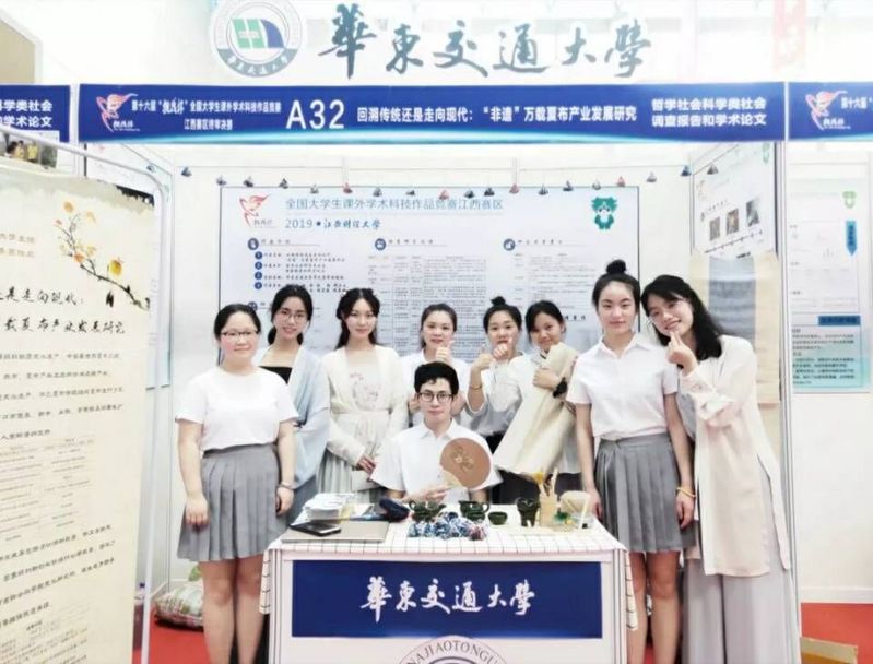 华之夏布课题组是在我院陈璐老师指导下,以研究“非遗”夏布相关问题为主要方向,由魏昊语、赵恒同学组建而成。本次参赛成员有魏昊语、赵恒、黄永、郑立文、张颖、席宁、程宏磊、程景媛、潘丽如同学。自2017年第一次接触到非物质文化遗产——万载夏布开始,课题组成员就被其独特的文化内涵与传统技艺活态传承的魅力所吸引,继而逐渐产生了对于保护非遗传统文化的强烈的社会责任感,以及对万载夏布产业扶贫的不懈追求。课题组带着一份“自觉”和“自信”深入到中国的传统文化中去,先后去往宜春、南昌、上饶、新余、景德镇、浏阳等多地进行调研。结合时代条件,对万载夏布产业进行自主地“创造性转化”和“创新性发展”是课题组致力于研究非遗万载夏布的初心。目前,课题组公开发表论文2篇,完成多份调研报告,完成了国家级大学生创新训练计划课题申报,积极参加“互联网+”大学生创新创业大赛青年红色筑梦之旅赛道,运营维护“华之夏布工作室”公众号,引起了主流媒体的报道关注等。