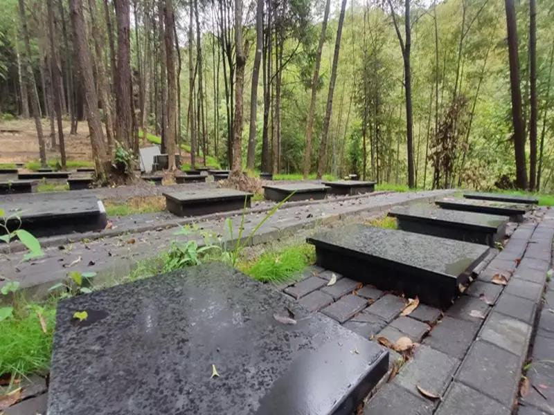沿着山间公路而行,特色的生态墓地就隐藏在不起眼的小路深处,顺随砖红色蜿蜒而上,公墓分布在密布的丛林之中。株溪林场生态墓地建立于2018年,与乡村传统墓葬环境不同,生态墓地首先以公墓形式提倡乡村民众共同使用,以此取代传统较为随意的土葬形式。通过这样的方式,减少传统墓葬方式对土地大量分散的占用,节省出较大面积的土地作为耕地。据曾场长介绍,目前该生态墓地面向乡村民众实行极其优惠的政策,低负担墓葬一定程度上降低村民压力,也间接对生态墓地使用进行了推广。