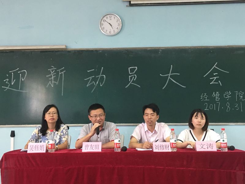 8月31日,2017年经管学院迎新动员大会在31栋顺利举行。院党委副书记曾友田,学工办主任、团委书记刘修财,学工办副主任吴钰娟,学工办副主任、团委副书记文涛,第三十七任学生会主席王伟杰、团委副书记吴敏出席本次大会并做动员工作。