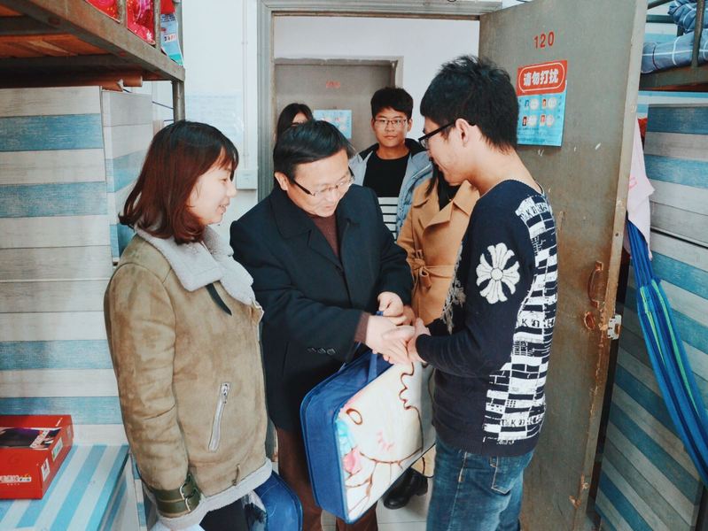 情意暖寒冬,冬季送温暖。12月23日,党委副书记曾友田,学工办副主任吴钰娟,辅导员老师文涛在学生宿舍44栋亲自为经济困难的学生们发放保暖内衣,毛毯,被褥等生活用品,并对同学们进行了慰问。