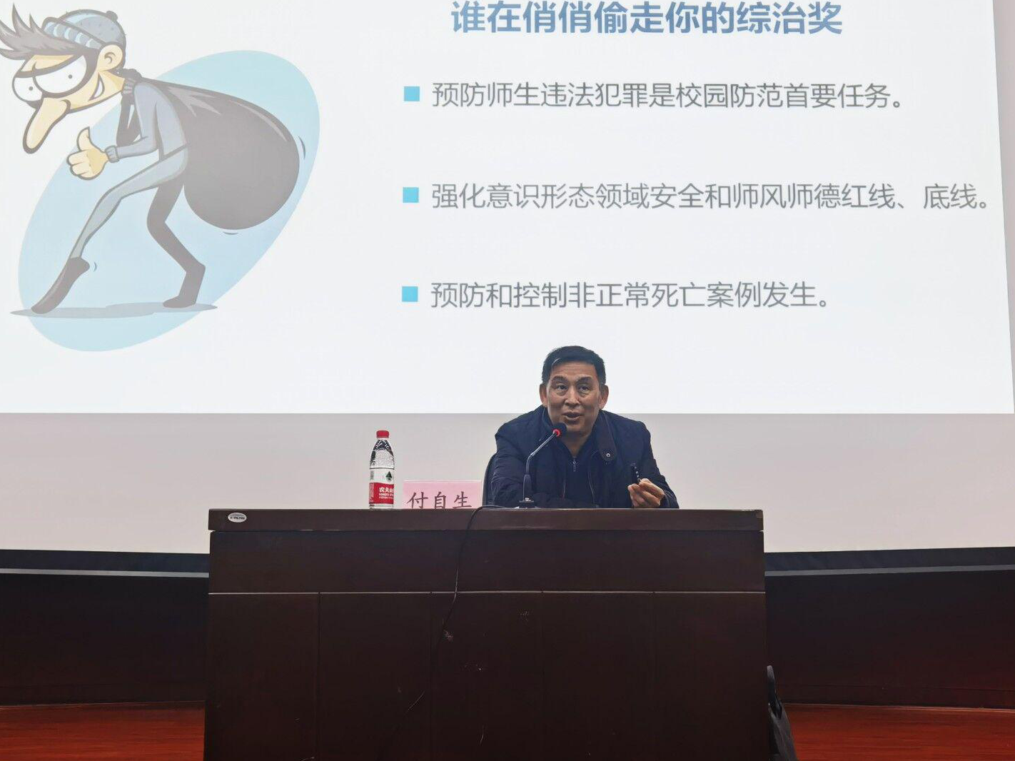 为了强化校园防范,全面提升平安校园的建设能力,我院特邀太阳集团2007保卫处处长、武装部部长、综治办主任付自生老师于3月18日下午四点三十分在北区圆形报告厅开展以“综治安全”为主题的志刚讲坛。
