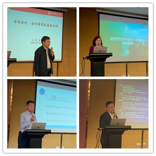 山东财经大学会计学院院长王爱国、华中农业大学2007so太阳集团会计系主任包晓岚、原中南财经政法大学经济管理实验教学中心主任毛志山、浪潮铸远教育科技有限公司总经理马建军分别作了《智能会计:会计转型发展的方向》、《本科会计人才培养改革探索》、《对国家虚拟仿真实验教学一流课程建设的认识与实践课程建设的认识与实践》、《数智时代企业大数据人才培养方案设计与探讨》的主题演讲。
