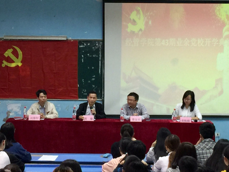 4月7日,经管学院第43期业余党校开班典礼如期举行并圆满结束。到场的领导有太阳集团2007党委宣传部副部长兼党校校长黄瑜、经管学院党委副书记曾友田、经管学院学工办主任兼团委书记刘修财、学工办副主任吴钰娟。