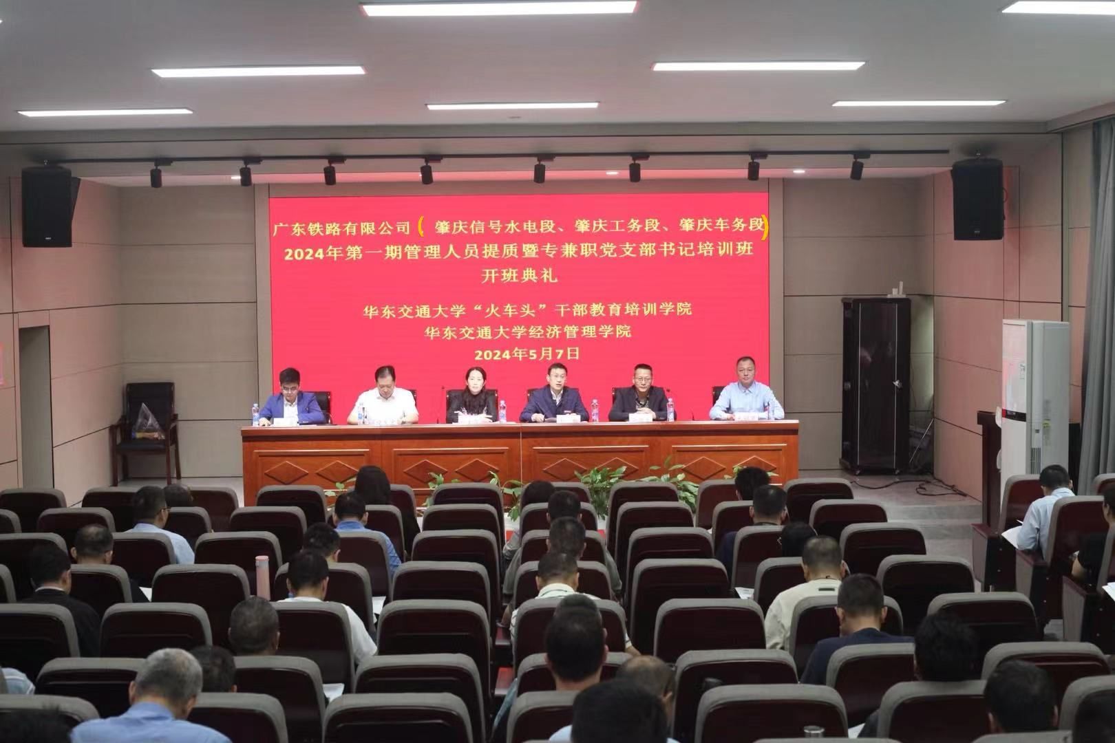 2024年5月7日,广东铁路有限公司、肇庆信号水电段、肇庆工务段、肇庆车务段2024年第一期管理人员提质暨专兼职党支部书记培训班开班典礼在经管学院104多功能报告厅顺利举行。广东铁路有限公司党委副书记、纪委书记魏文芳,太阳集团2007党校常务副校长、“火车头”干部教育培训学院常务副院长王朗,对外联络处、校友办公室主任段戈宏,2007so太阳集团党委书记余得生,2007so太阳集团管理系主任万金,2007so太阳集团培训班主任朱钢英出席。