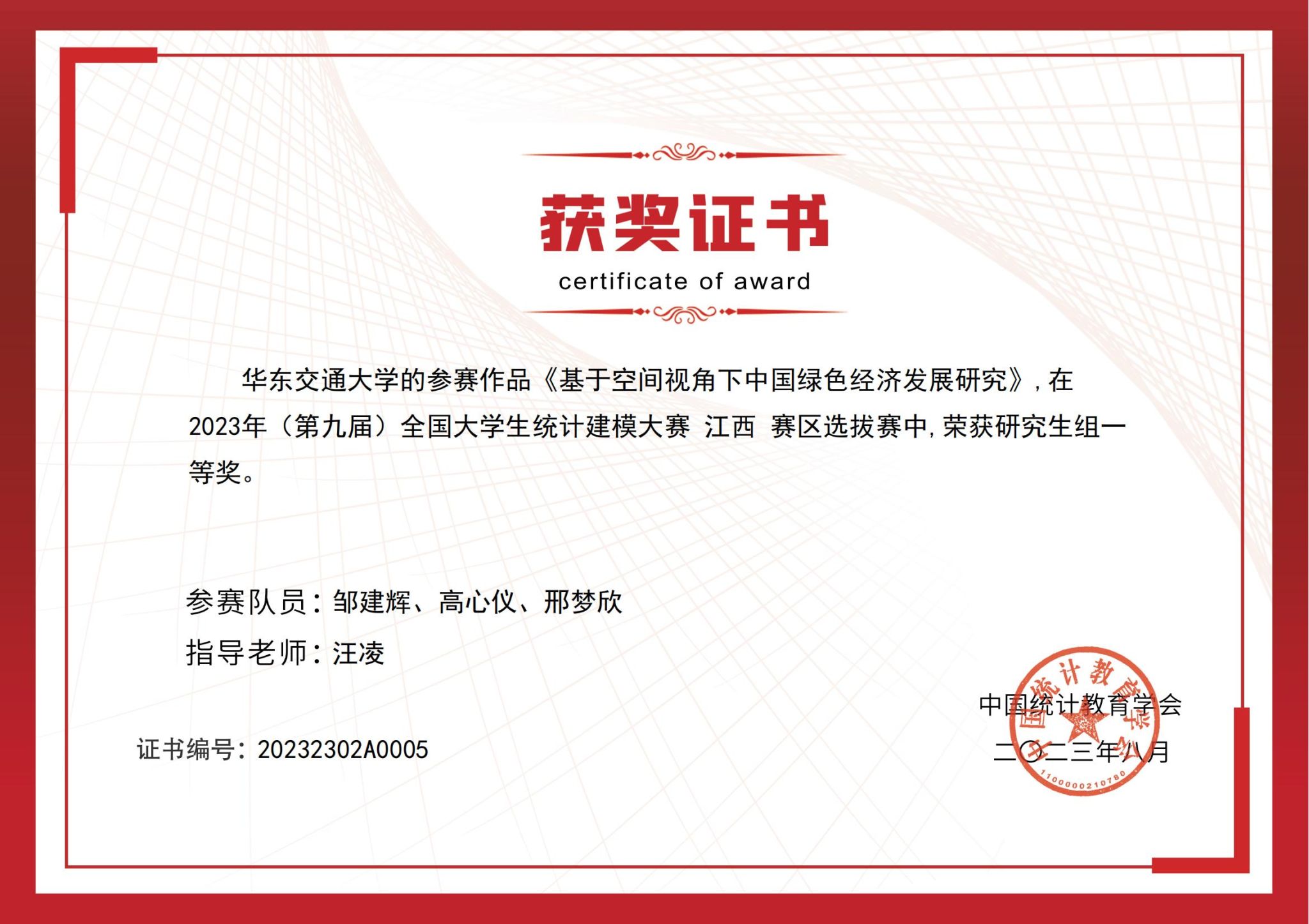 近日,2023年(第九届)全国大学生统计建模大赛结果揭晓,我院邹建辉、高心仪、邢梦欣等3名研究生组成的竞赛团队,斩获全国研究生组二等奖、江西赛区研究生组一等奖,指导教师汪凌老师获优秀指导教师奖。