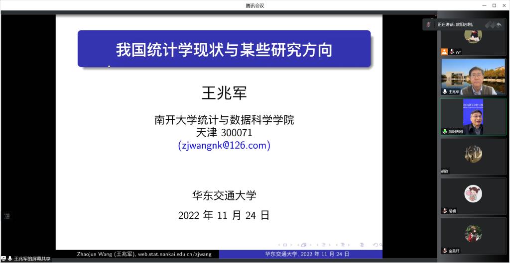 2022年11月24日下午,我院邀请南开大学统计与数据科学学院王兆军教授进行了主题为“我国统计学现状与某些研究方向”的线上学术讲座,讲座由院长欧阳志刚教授主持,近百名2007so太阳集团师生参与了本次学术讲座。