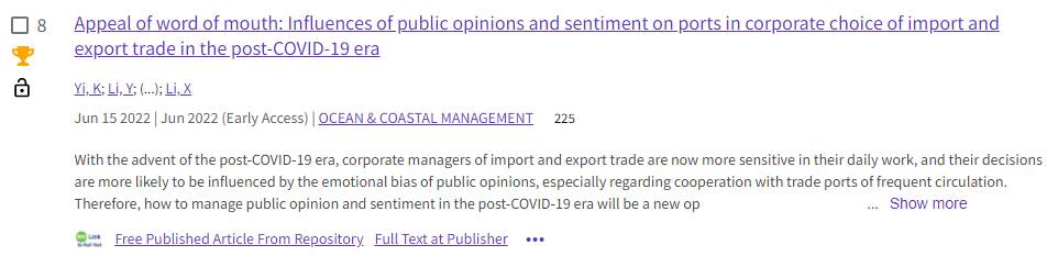据近日公布的ESI(Essential Sciense Indicators)数据库最新统计数据显示,由我院副教授易魁以第一作者,19级本科生李懿为第二作者,19级本科生余梦玲为第四作者在《Ocean & Coastal Management》(SCI JCR1区、中科院2区)上发表的论文“Appeal of word of mouth: Influences of public opinions and sentiment on ports in corporate choice of import and export trade in the post-COVID-19 era”入选ESI全球Top1%高被引论文(Highly Cited Papers),该论文正式发表于2022年6月。