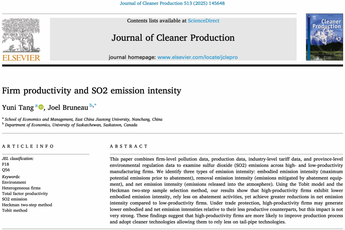 近日,我院唐雨妮老师作为第一作者在环境及可持续发展领域国际著名期刊《Journal of Cleaner Production》(中科院1区TOP期刊,IF 9.8)发表题为“Firm productivity and SO2 emission intensity”的高质量论文,特此报喜!