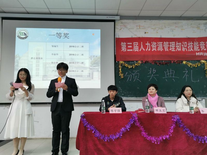 11月28日下午,由经管学院承办,HR协会协办的第三届人力资源管理知识技能大赛颁奖仪式在31栋116顺利举行,我院党委副书记田玉兰老师,HR协会副会长陈宇强,李君担任嘉宾,为获奖队伍颁奖。