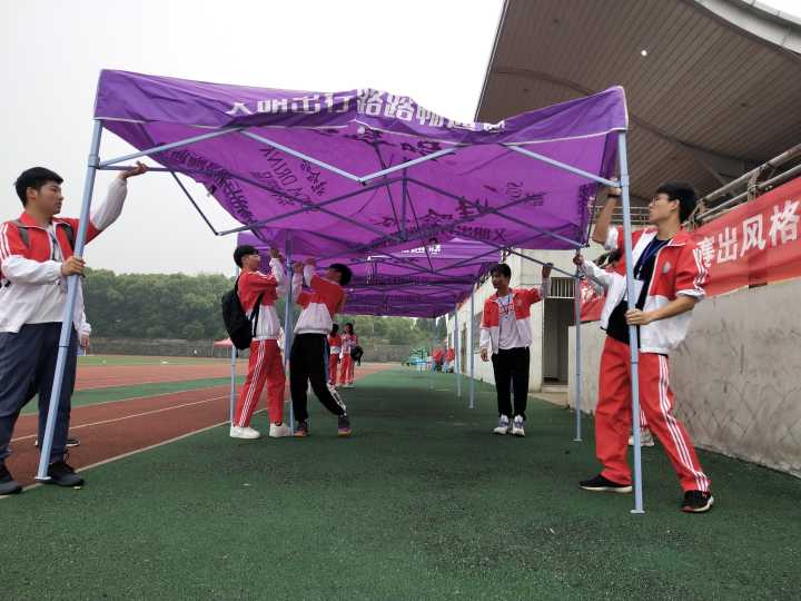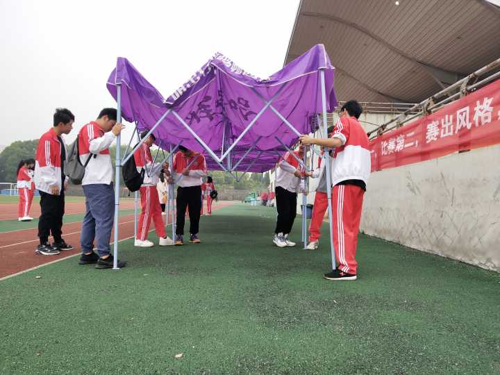 4月12日晚上,体育部人员在夜色的笼罩下挂起了每个班级精心准备的鼓舞士气的横幅。为了保证运动会的顺利进行,4月13日7点,体育部、播音员和裁判员等幕后工作人员早早达到运动场地,筹备运动会开幕式的场地布置、人员部署等相关事宜。