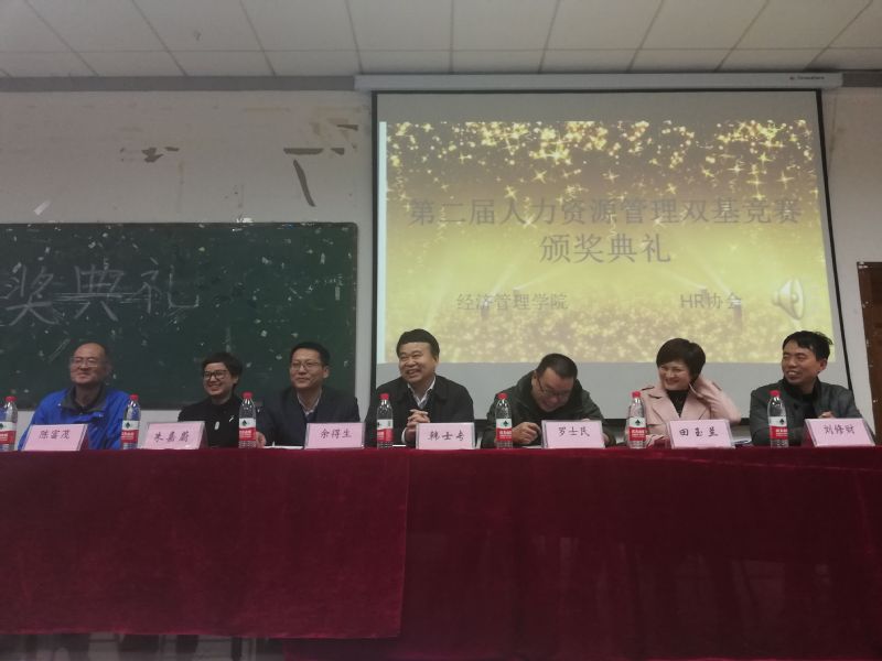 经管文工团开场热舞为我们的颁奖典礼拉开序幕。为活跃气氛,主持人准备了十个关于HR的小知识,同学们踊跃抢答,并获得小奖品。伴随着同学们热烈的掌声,领导们依次入场。颁奖典礼正式开始前,韩士专院长发表讲话,表示学院对HR双基竞赛的重视与支持,并鼓励同学们积极参与。