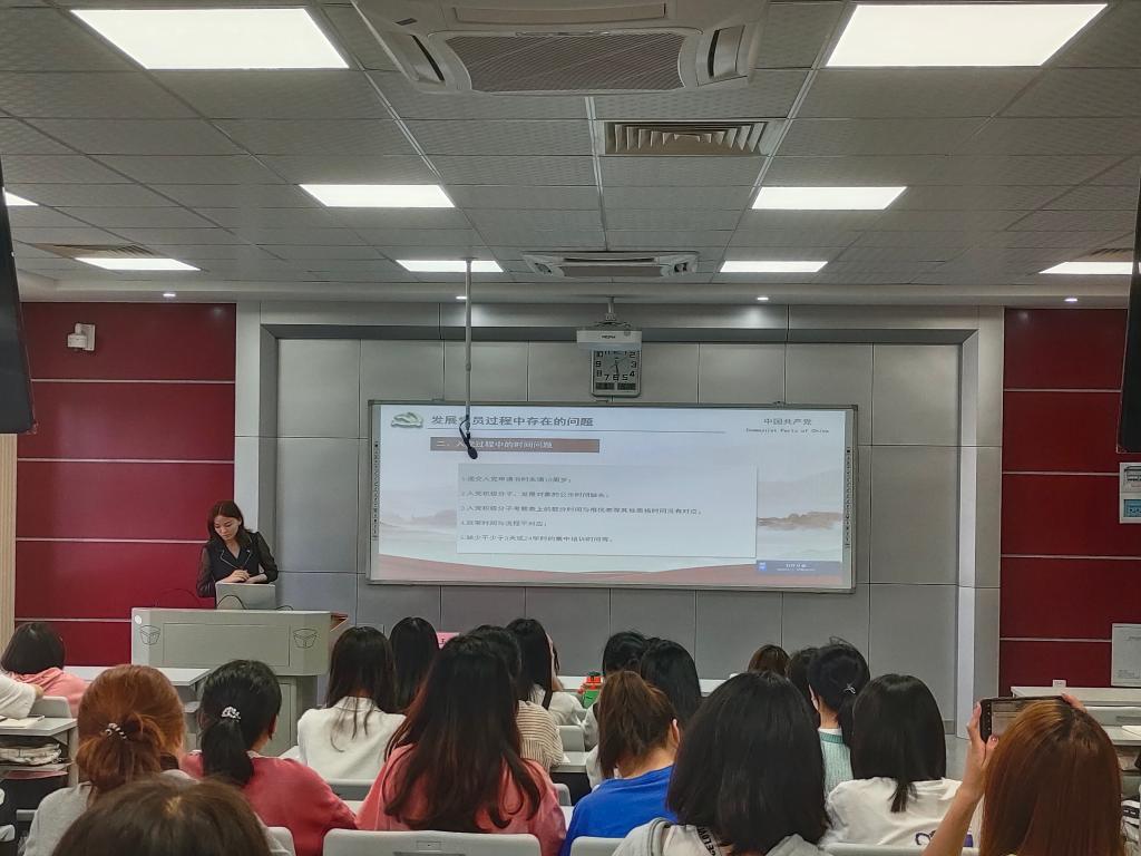 常玉凤老师重点指出在入党过程中我们应该注意的几点问题,第一,入党过程中的思想问题,如入党申请书存在思想不端正的情况,存在上网抄袭现象;第二,入党过程中的时间问题,如递交入党申请书时未满18周岁,或入党积极分子、发展对象的公示时间缺失等现象;第三,入党过程中的字迹问题,如入党积极分子考察表、预备党员考察表等表格中,同一人书写的内容字迹不一致,或所有签字需要手签,但有部分材料仍然存在印盖签字章等现象。