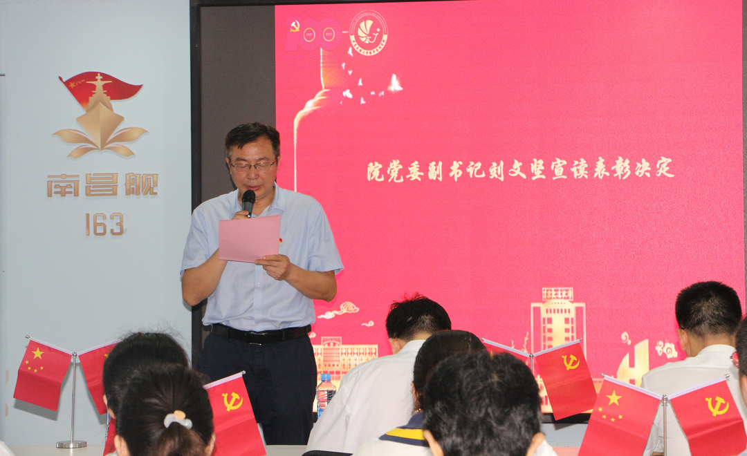 院党委副书记刘文坚宣读《关于2007so太阳集团2021年度优秀党员、优秀党务工作者、先进基层党支部表彰决定》。希望受到表彰的各支部和个人以此为新的起点,珍惜荣誉、戒骄戒躁、发扬成绩、再接再厉,充分发挥党支部的战斗堡垒作用和共产党员的先锋模范作用。随后,学院党委班子成员为优秀共产党员、优秀党务工作者、先进基层党支部、“学习强国”学习达人颁发了荣誉证书。