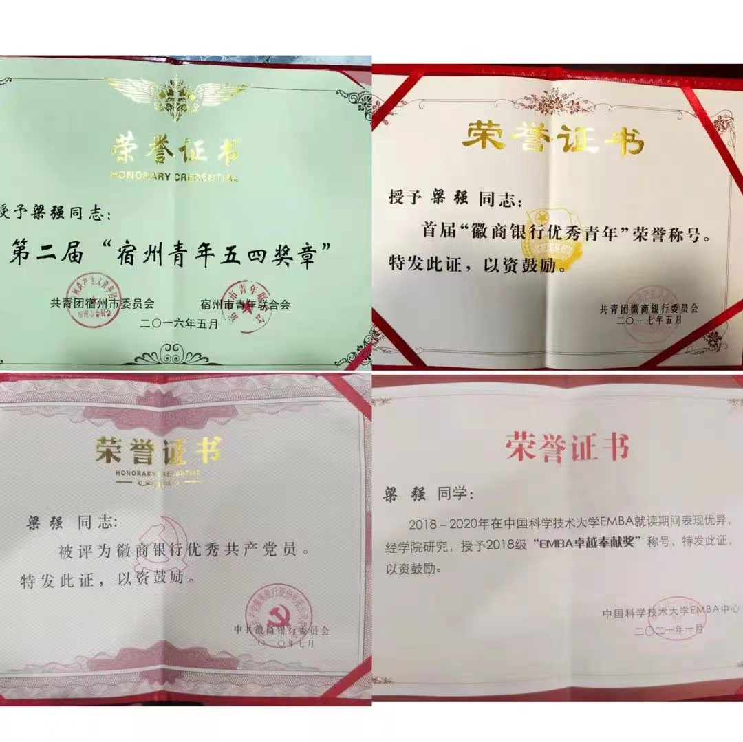 2014年梁强同志被调往灵璧县支行,没有因为与爱人、家庭分开有所抱怨,而是迅速进入角色投入到开发基础客户群体和支持县域实体经济当中,通过不断联系县委县政府和走访本土中小企业,当年即为灵璧县投放土地储备贷款1亿元,县一中项目贷款5000万元,新增小企业客户10余户,优质高效的服务让该同志不仅在当地老百姓与企业当中拥有良好的口碑,同样在当地县委县政府留下了深刻的印象,灵璧支行成立短短三年中小企业贷款份额已经跃居全县第二名。2014-2016年,梁强先后获得第二届“宿州青年五四奖章”、第三节“安徽省最美青工”称号。