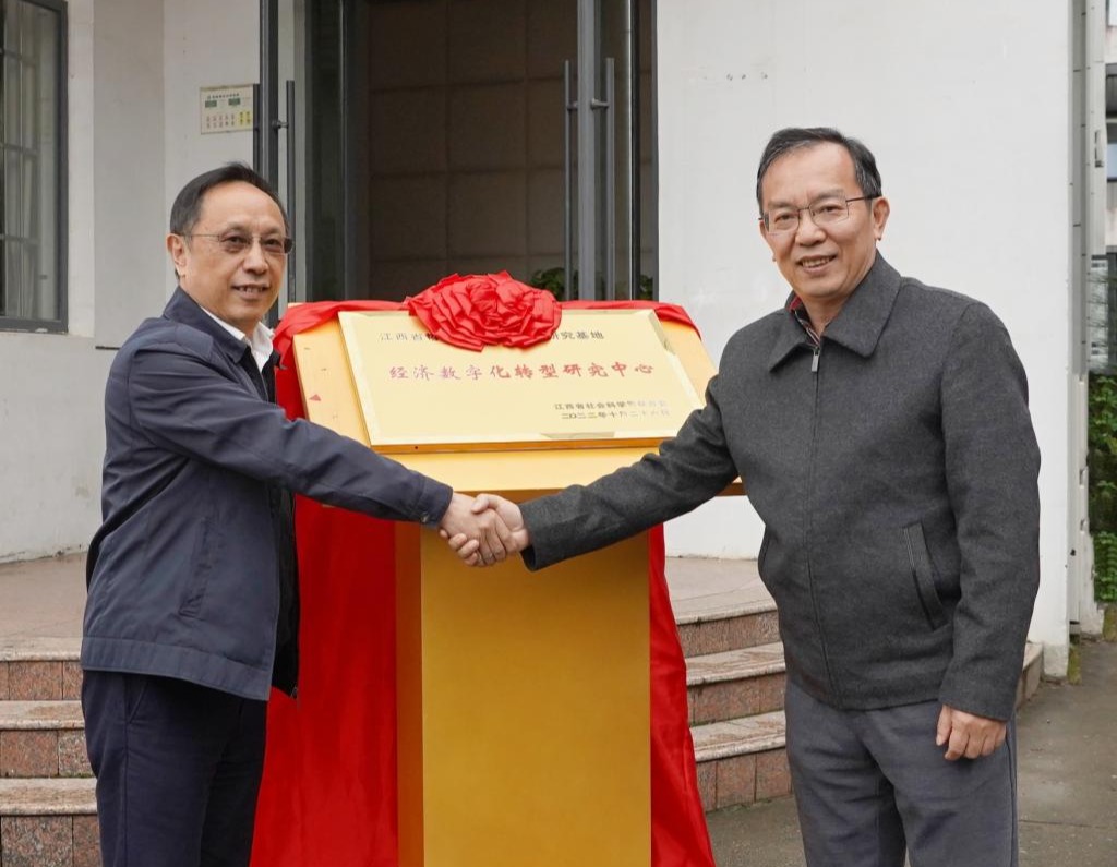 4月6日,“江西省哲学社会科学重点研究基地——经济数字化转型研究中心”揭牌仪式在我校举行。省社科联党组成员、副主席刘清荣,校党委书记柳和生共同为研究基地揭牌。校党委委员、副校长罗文俊出席,校党委委员、副校长杨德敏主持。