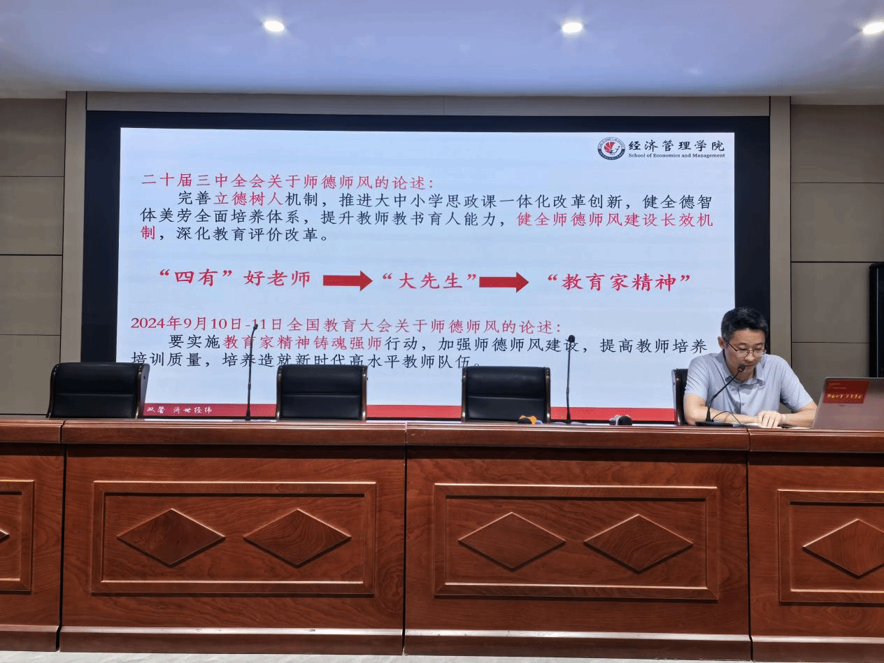 首先,王显涛副书记以深刻领会党的二十届三中全会精神为切入点,结合学院工作实际,提出了学习要求。其次,报告从何为师德谈起,以古论今,以学院师德师风教师标兵为例,准确理解大力弘扬教育家精神的价值意蕴。最后,报告阐述了如何以教育家精神锻造新时代的强教之师。