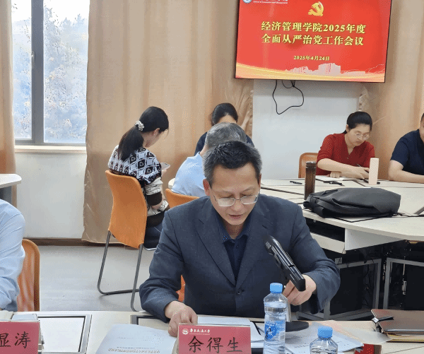 2025年4月24日,经管学院在大数据中心召开全面从严治党专题会议。校党委委员、副校长欧阳志刚,经管学院党委领导班子、全体教职工以及学生党员代表参加此次会议,会议旨在深入贯彻党中央全面从严治党决策部署,对学院党建与事业发展进行再动员、再部署。会议由经管学院党委书记余得生主持。