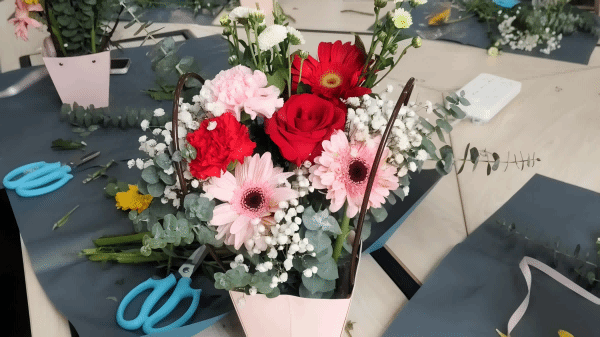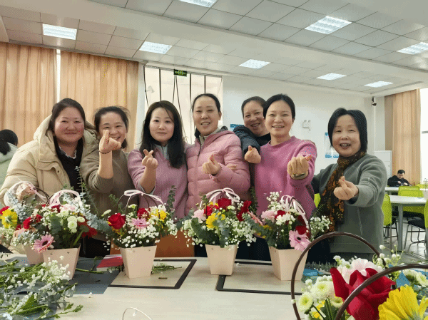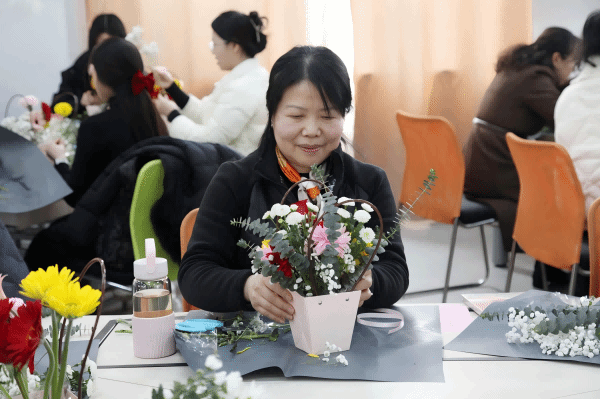 随后,插花老师为在场的教职工们进行了一场生动的插花教学。她详细讲解了插花的基本技巧、色彩搭配以及花材选择等知识,并现场示范制作了一款精美的花束。在她的指导下,老师们迅速掌握了插花的要点,纷纷动手制作属于自己的作品。在插花过程中,老师们充分发挥自己的创造力,一边精心布置花束,一边互相交流心得。活动现场洋溢着欢声笑语,气氛温馨而热烈。完成作品后,老师们纷纷合影留念,记录下这美好的瞬间。